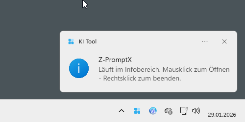 Z-PromptX ist eine Tray-Anwendung. Das heißt, sie läuft im Hintergrund und zeigt nur ein kleines Symbol im Infobereich der Taskleiste, damit du sie schnell öffnen oder beenden kannst, ohne dass ständig ein Fenster offen ist. Nach dem Start der Anwendung ist Z-PromptX im Infobereich zu finden, dort wo auch Lautstärke, Netzwerk und Akku sitzen. Im Stand-by ist das Programm sehr sparsam und belegt typischerweise nur etwa 20 MB Arbeitsspeicher