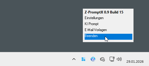 Beendet wird Z-PromptX über das Tray-Symbol. Dazu machst du einen Rechtsklick auf das Symbol im Infobereich und wählst im Menü den Punkt „Beenden“. Danach ist die Anwendung wirklich aus und läuft nicht mehr im Hintergrund.